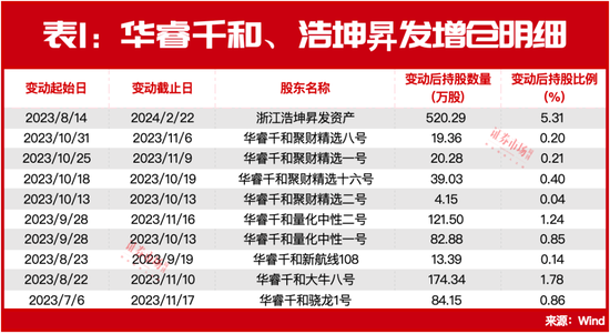 曾于2023年11月20日,锦好医疗发布简式权益变动报告书称,华睿千和旗下的9只私募产品于2023年7月6日~2023年11月17日期间购入公司559万股,占公司股份比例达到了5.7006%(见表1)。对于举牌目的,华睿千和与浩坤昇发相同,同样表示对上市公司价值的高度认可和对上市公司未来发展前景的信心。