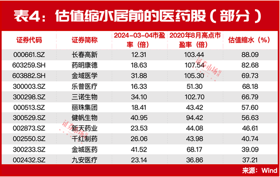 回顾来看,自医药板块于2020年8月触及阶段高点之后即迎来连续调整,至今累计下跌超过35%,当前,医药股估值水平约为53倍,相较于2020年8月122倍的估值高点缩水近6成。另据观察,上述不少回购金额超5000万元的医药股估值也出现了大幅“打折”,如长春高新、药明康德、金域医学、乐普医疗等估值水平缩水均超过6成(见表4)。